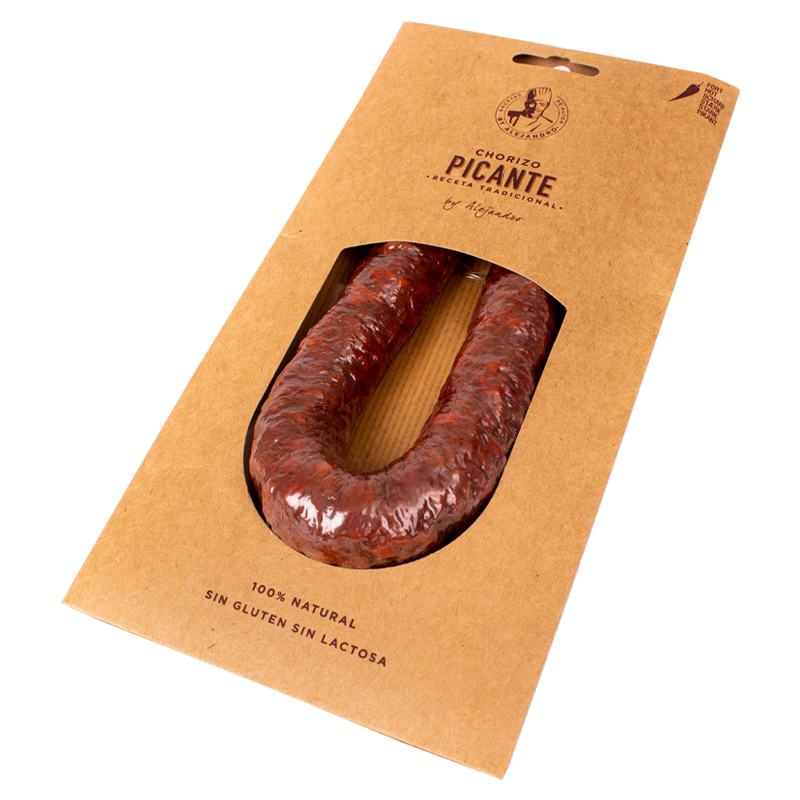 Traditional Spanish chorizo crafted by Embutidos Alejandro in Logroño, La Rioja, using natural ingredients and time-honored techniques. This spicy chorizo is seasoned with premium paprika, garlic, salt, and spices for authentic flavor. Free from preservatives, coloring agents, and gluten, it delivers genuine Spanish taste in every slice. Ready to eat straight from the package.