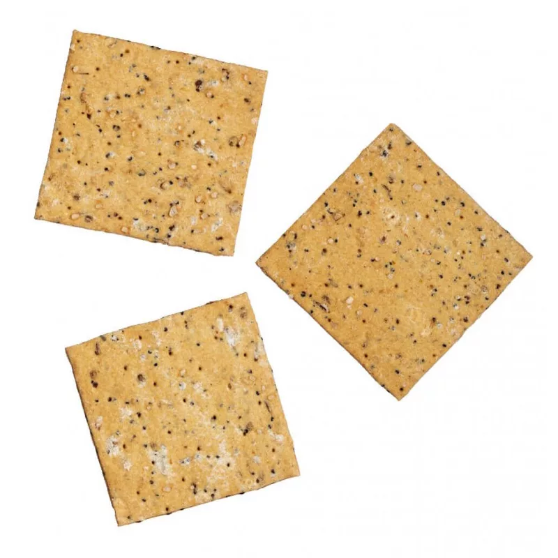 Crispy artisan crackers infused with delicate sesame, poppy seeds, coriander and cumin. Perfect accompaniment to strong red wines or fruity rosés.