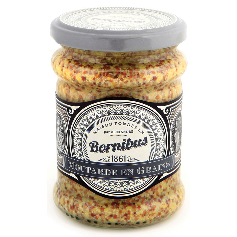 Bornibus wholegrain mustard combines tradition with authenticity, featuring whole mustard seeds mixed with water, wine vinegar, salt, sugar, and select spices. This indispensable condiment has won around forty medals in major international competitions. Perfect for enhancing soups, sauces, salads, meats, pickles, eggs, sandwiches and vegetables. Contains no artificial colorants.