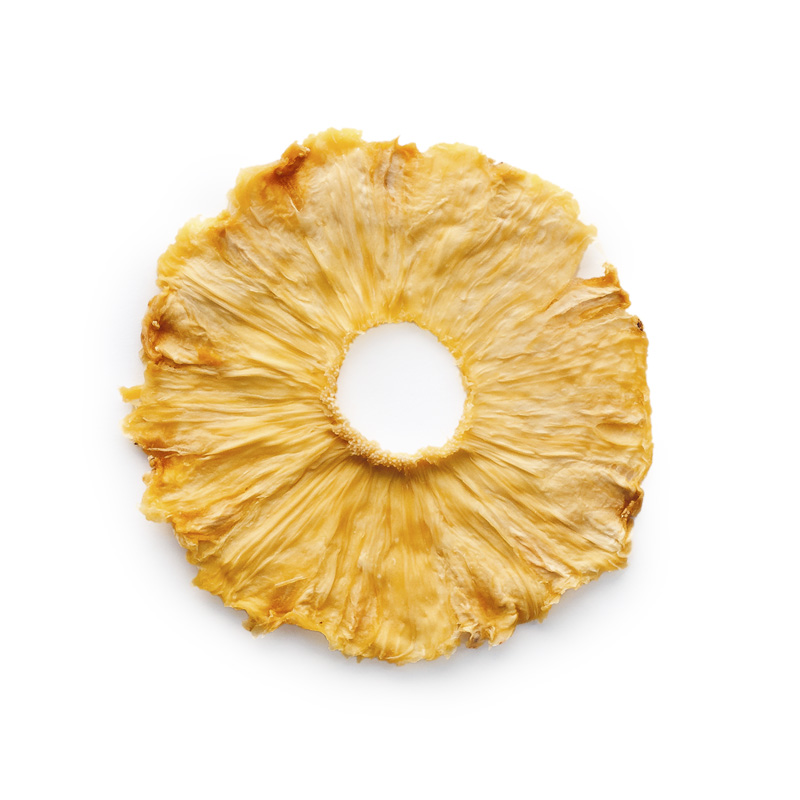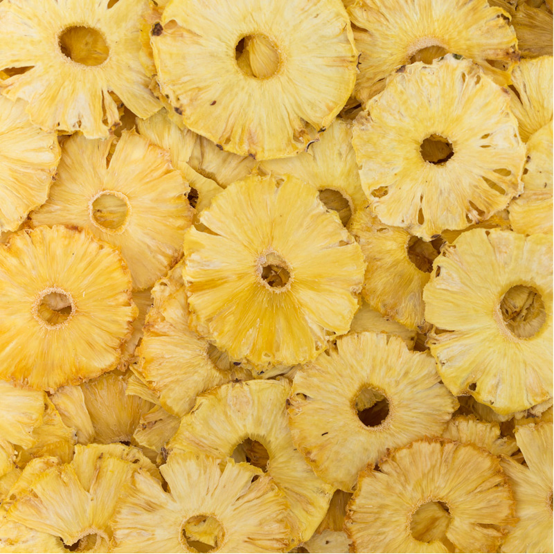 Sweet and intense dehydrated pineapple slices, perfect as a snack or cocktail ingredient. Preserved in multidose jars to maintain aroma, flavor, and vibrant color.