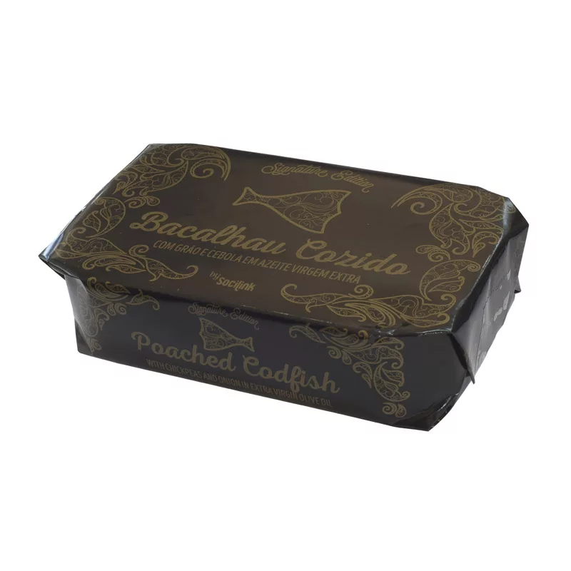 Traditional Portuguese preserved codfish with chickpeas and onions in premium extra virgin olive oil. Rigorously selected fish ensures exceptional quality in every bite.