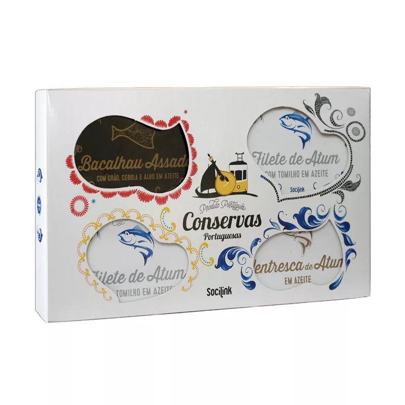 Premium Portuguese canned fish set featuring four signature products: mackerel roe, tuna fillet with thyme, tuna ventresca, and codfish with chickpeas—all handmade and packed in olive oil.