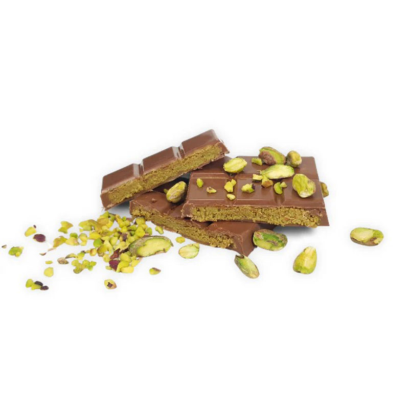 Indulge in luxury with this 38% milk chocolate bar inspired by Dubai, featuring crunchy pistachio pieces and pure cocoa butter crafted by French master chocolatiers.