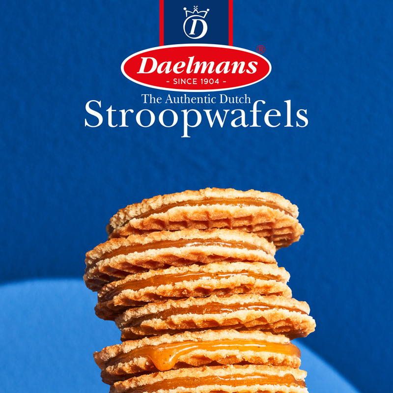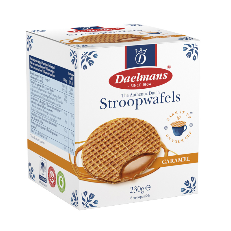 Daelmans caramel stroopwafels feature two crispy waffle layers filled with a soft, sweet butter syrup and natural Bourbon vanilla. Baked according to the traditional family recipe since 1904, using only the finest ingredients. These iconic Dutch treats can be enjoyed on their own, placed on hot coffee or tea, or used to decorate desserts. A world-renowned favourite that continues to delight new generations of stroopwafel lovers.