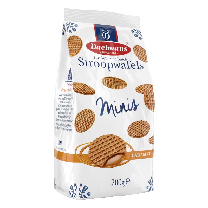 Daelmans mini caramel stroopwafels are two crispy waffles filled with soft butter syrup enriched with natural Bourbon vanilla, made according to the traditional family recipe using only the best ingredients. These classic Dutch cookies have been a favorite for years and can be enjoyed straight from the package, placed on hot coffee or tea, or used to decorate desserts. Each stroopwafel offers the perfect balance of crispy waffle and smooth caramel filling. A delicious treat that brings authentic Dutch craftsmanship to your table.