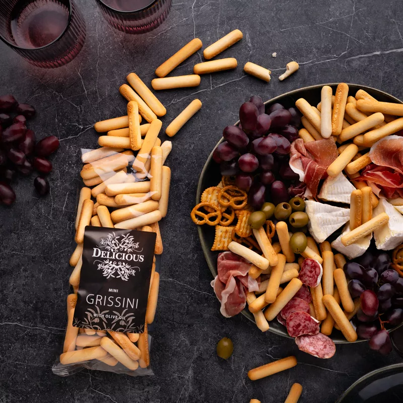 These mini grissini sticks are a traditional Italian snack originating from the Piemonte region, known for their long, thin shape and irresistibly crunchy texture. Made with simple, quality ingredients including wheat flour, olive oil, yeast, and salt, they are baked until golden brown and crispy. Versatile and delicious on their own, they make an excellent addition to charcuterie boards, festive buffets, or can be served alongside soups, salads, dips, olives, and cheese.