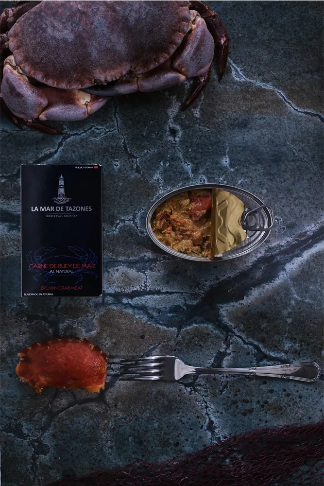 This premium crab meat combines hand-selected meat from all parts of the brown crab: body, legs, inner shell, and roe. Sourced from the Cantabrian sea, the shellfish is traditionally cooked in seawater and hand-extracted using time-honored methods, then carefully canned. The unique blend of male and female crabs delivers a distinctive, robust flavor profile perfect for spreads, rice dishes, tapas, and sautéed preparations.
