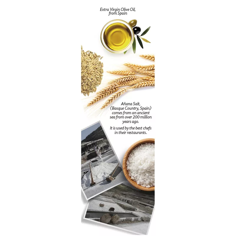 These delicious crackers blend wheat and rye flours with salt from the renowned Añana Valley in Spain’s Basque Country, a culinary treasure recognized for its exceptional quality. Enhanced with 16% extra virgin olive oil, they deliver a rich, satisfying taste and texture. Ideal for pairing with any type of cheese or as part of a sophisticated charcuterie board. The combination of premium ingredients makes them a standout choice for those who appreciate artisanal, carefully crafted snacks.