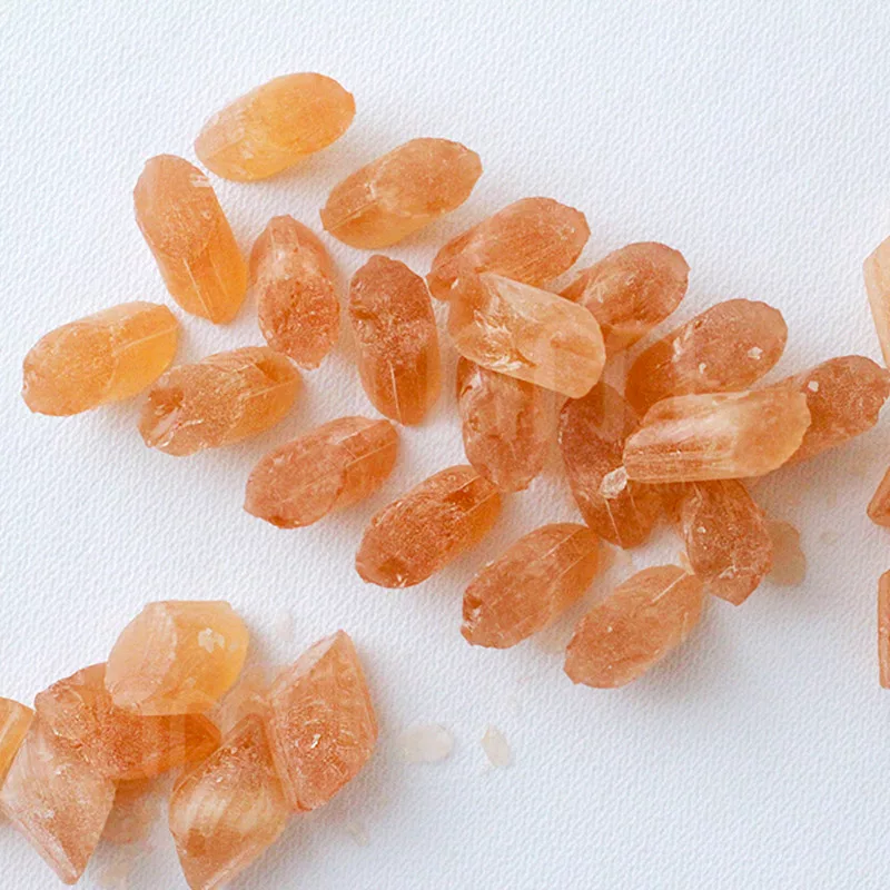 Artisanal fennel candies from Madeira with a distinctive yellow-orange hue and translucent appearance. Traditionally enjoyed as a sweet treat or natural cough reliever.