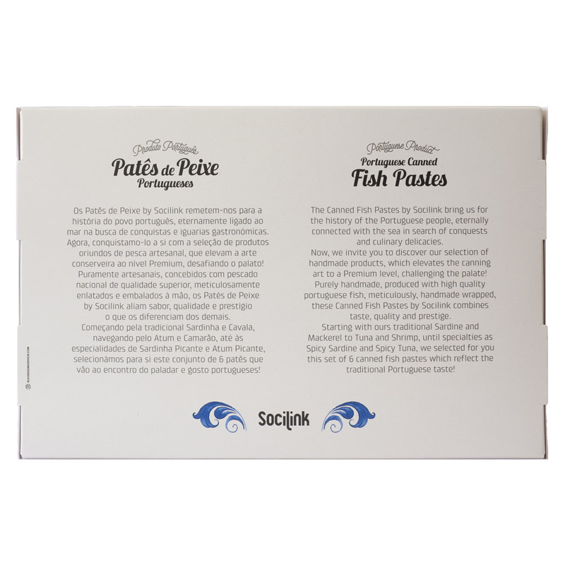 A premium Portuguese assortment of six artisanal fish pâtés featuring sardine, tuna, mackerel, shrimp, cod, and salmon. Handmade with high-quality national fish and fine spices for an elevated gourmet experience.
