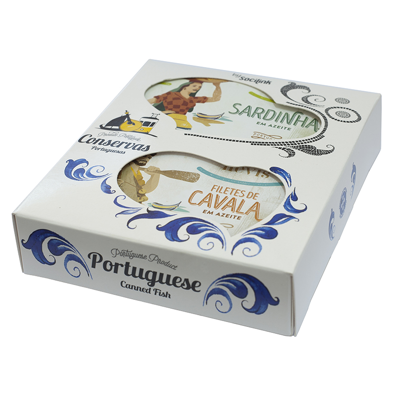 A premium Portuguese canned fish set featuring hand-selected sardines and mackerel fillets, artisanally prepared and preserved in extra virgin olive oil. Each set contains two 120g tins of pure, high-quality fish.