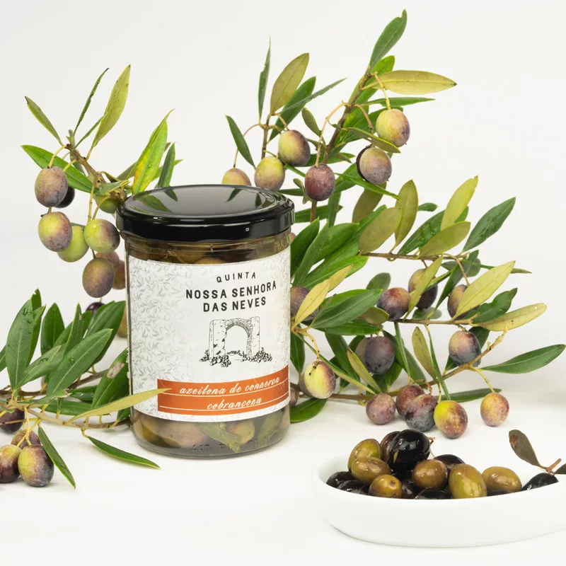 Premium Portuguese Cobrançosa olives naturally cured with just salt, oregano, and bay leaves. Harvested from ancient olive groves surrounding the centuries-old chapel of Nossa Senhora das Neves in the Alentejo region.