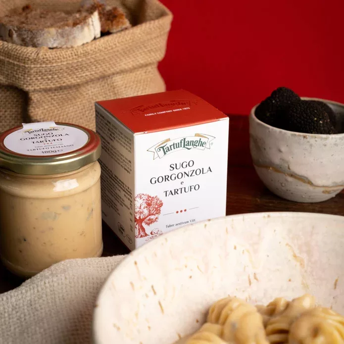 This premium sauce combines the slightly spicy, rich taste of Gorgonzola PDO cheese with the distinctive aroma of summer truffles. Ideal for seasoning short pastas, gnocchi, ravioli, risottos, glazing vegetables, and stuffing crêpes and vol-au-vents. Made in Italy with high-quality ingredients, it delivers an authentic truffle experience in every spoonful. Refrigerate after opening and use within 7 days.