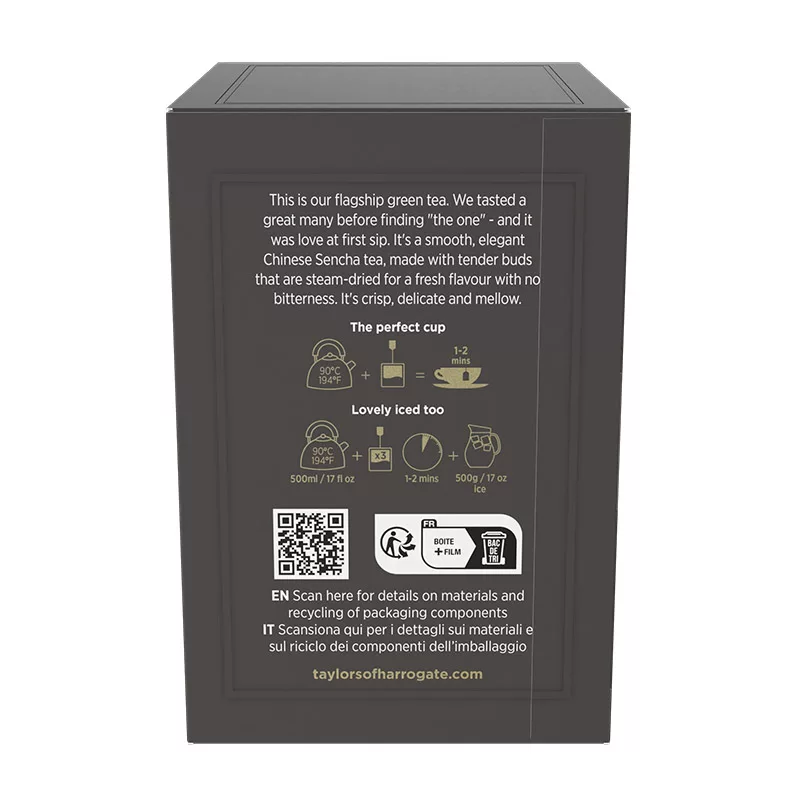 Taylors of Harrogate sources their flagship green tea from Zhejiang Province in Eastern China, a region renowned for producing exceptional sencha varieties. The leaves are gently steam-dried to preserve their delicate flavour and natural characteristics. In the cup, you’ll experience a mellow, gentle tea with a touch of crispness and subtle floral notes, beautifully clear and refreshing. Brew at 90°C for 1-2 minutes to achieve the perfect cup.