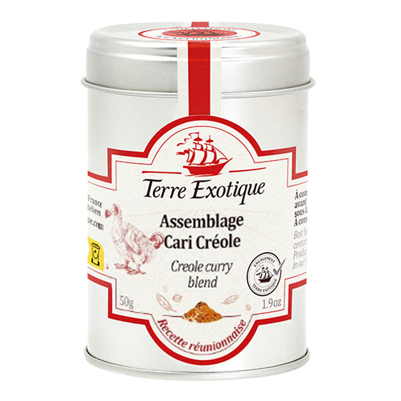 A vibrant French spice blend featuring paprika, kaffir lime, and pink peppercorn for authentic Creole curry dishes. Perfect for chicken, fish, and vegetarian preparations.