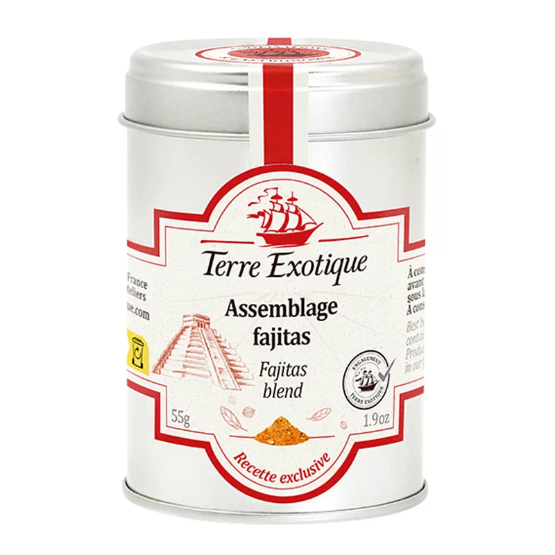 Terre Exotique’s fajitas spice blend is a carefully balanced Tex-Mex flavor symphony that combines the heat of smoked paprika, chipotle pepper, and ancho chili with fresh coriander and oregano. Garlic and onion provide aromatic depth, while cumin and black pepper add warmth and spice, with subtle notes of fennel, cinnamon, and cloves for complexity. Use it to season fajitas, grilled meats, or vegetables, or add it to guacamoles, marinades, and appetizer sauces for authentic Tex-Mex flavor.