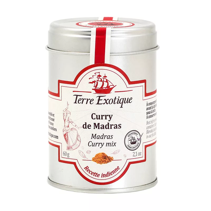 Madras curry is a traditional spice mix originating from Chennai in South India, known for its bold, spicy character and warm tomato undertones. Terre Exotique’s blend combines turmeric, coriander, cumin, black pepper, fennel, mustard, fenugreek, ginger, cardamom, cinnamon, and cloves for authentic flavor. Ideal for seasoning lamb, white meat, and vegetables, especially when paired with tropical fruits like bananas, apples, or pineapple. A versatile blend that enhances both savory and sweet preparations.