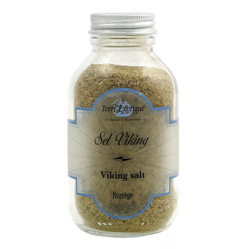 Terre Exotique Viking Smoked Salt is a premium blend inspired by a lost recipe from Egersund, Norway, recently rediscovered. This fine salt combines salt, onions, smoked salt, pepper, and turmeric for a complex, smoky flavor profile with an intense, forest-like aroma. Ideal for gratin dauphinois, eggs, crunchy raw vegetables, and any dish needing a distinctive Nordic touch.